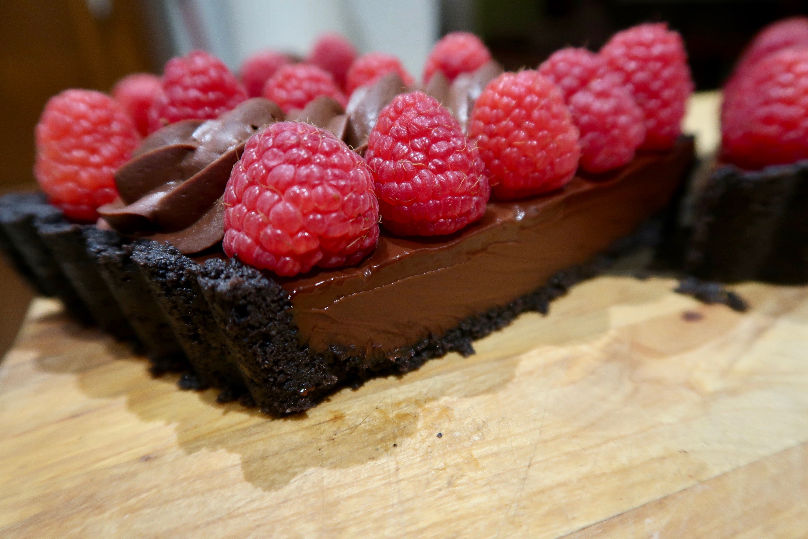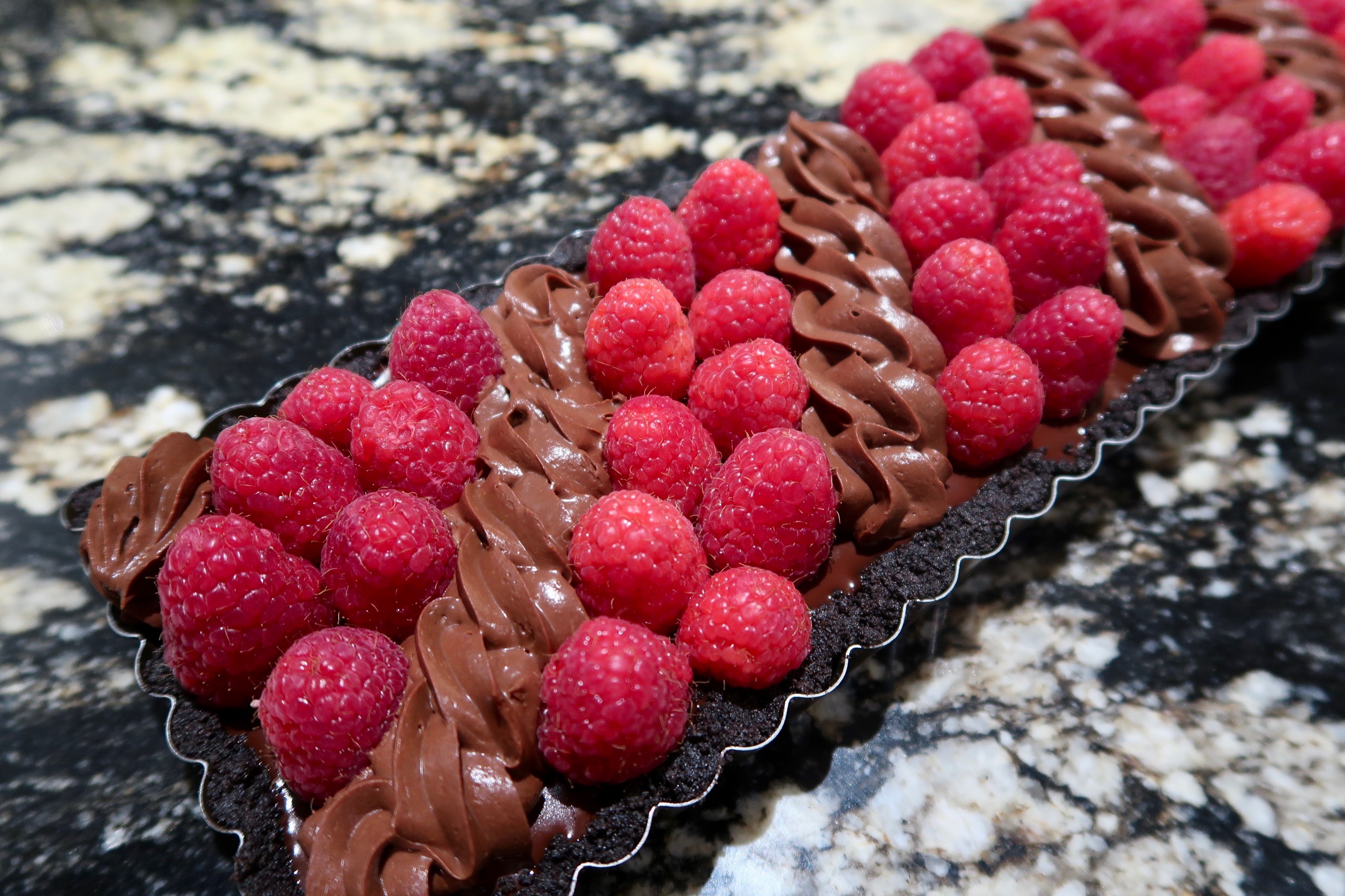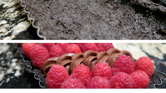 8. Once set, take the tart out of the fridge and decorate with the fresh raspberries and the whipped ganache.