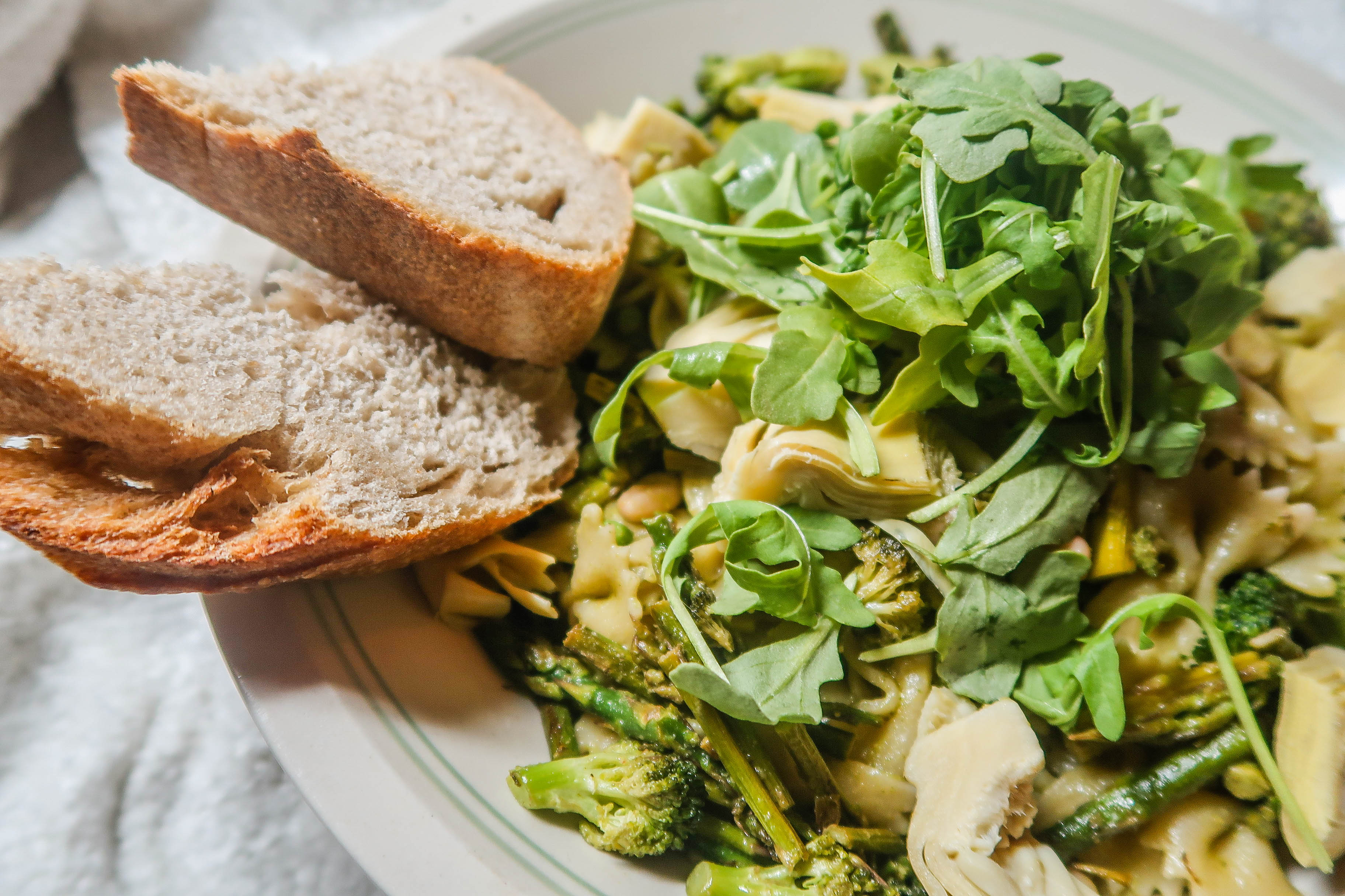 4. Drain de pasta, pour the pesto over the pasta and toss. Add the roasted veggies to the pasta